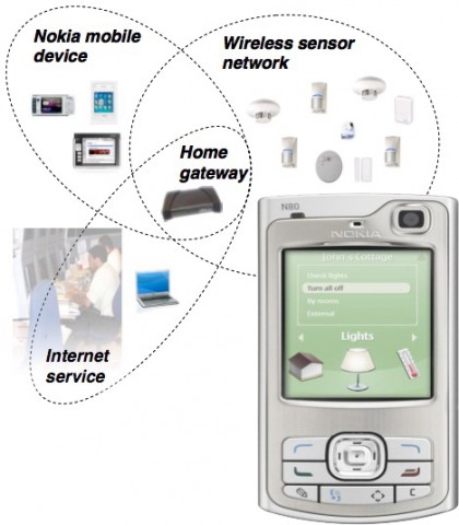Nokia has unveiled a cellphone-controlled "smart home" platform that will use Z-Wave and ZigBee enabled devices and a specially adapted WiFi draft-n gateway. Nokia Home Control Center is being described as an "open platform" combining sensors, CCTV, wireless networks and mobile devices, usable both inside the home as well as remotely via any device with a web browser. The first products will concentrate on home heating management.